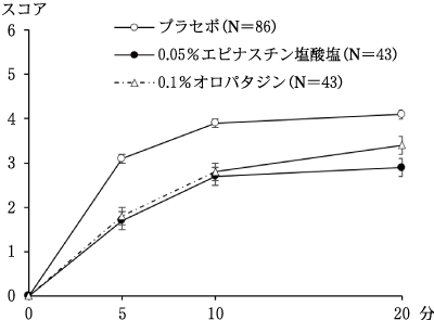 アレルギー性結膜炎患者(130例)を対象に、環境下で0.05%エピナスチン塩酸塩点眼液を1回1滴、1日4回(朝、昼、夕方、就寝前)8週間点眼する非盲検非対照試験(長期投与試験)を実施した結果、眼そう痒感スコア(平均値±標準誤差)はベースライン2.8±0.0(130例)、7日目2.2±0.1(130例)、14日目1.9±0.1(126例)、28日目1.5±0.1(125例)、42日目1.2±0.1(125例)、56日目0.6±0.1(124例)であった。副作用は2.3%(3/130例)に認められ、副作用は眼刺激1.5%(2/130例)、眼の異物感0.8%(1/130例)及び羞明0.8%(1/130例)であった。8),9)なお、アレルギー性結膜炎患者を対象に環境下で実施したプラセボ対照無作為化二重盲検並行群間比較試験では、有効性についてプラセボに対する優越性は示されなかった。10)