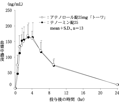 アテノロール錠25mg「トーワ」とテノーミン錠25を、クロスオーバー法によりそれぞれ1錠(アテノロールとして25mg)健康成人男子に絶食単回経口投与して血漿中未変化体濃度を測定し、得られた薬物動態パラメータ(AUC、Cmax)について統計解析を行った結果、両剤の生物学的同等性が確認された。2)