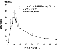 アミオダロン塩酸塩錠100mg「トーワ」とアンカロン錠100を、クロスオーバー法によりそれぞれ1錠(アミオダロン塩酸塩として100mg)健康成人男子に絶食単回経口投与して血漿中未変化体濃度を測定し、得られた薬物動態パラメータ(AUC、Cmax)について90%信頼区間法にて統計解析を行った結果、log(0.80)~log(1.25)の範囲内であり、両剤の生物学的同等性が確認された。3)