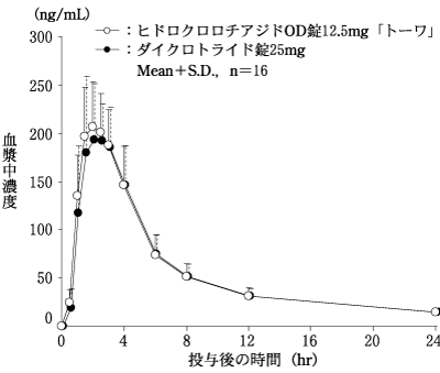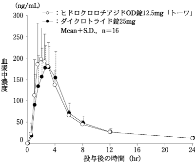 ヒドロクロロチアジドOD錠12.5mg「トーワ」2錠とダイクロトライド錠25mg 1錠(ヒドロクロロチアジドとして25mg)を、クロスオーバー法により健康成人男子に絶食単回経口投与(水なしで服用及び水で服用)して血漿中未変化体濃度を測定し、得られた薬物動態パラメータ(AUC、Cmax)について90%信頼区間法にて統計解析を行った結果、log(0.80)~log(1.25)の範囲内であり、両剤の生物学的同等性が確認された。8)
