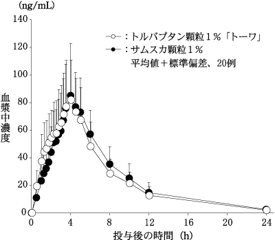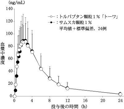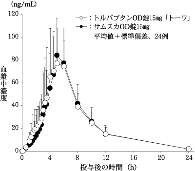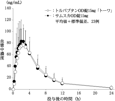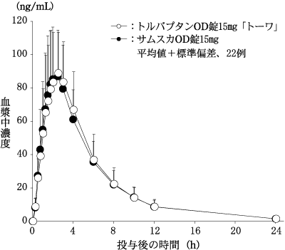 トルバプタンOD錠7.5mg「トーワ」は、トルバプタンOD錠15mg「トーワ」を標準製剤としたとき、溶出挙動が同等と判断され、生物学的に同等とみなされた。24)