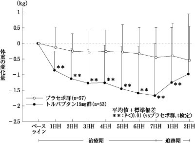 他の利尿薬を投与しても体液貯留が認められるうっ血性心不全患者を対象とした二重盲検比較試験において、トルバプタン15mg又はプラセボを1日1回7日間経口投与した。主要評価項目である最終投与時の体重変化量は、トルバプタン15mg群-1.54±1.61kg(ベースライン:59.42±12.30kg、53例)(平均値±標準偏差、以下同様)、プラセボ群-0.45±0.93kg(ベースライン:55.68±12.60kg、57例)であり、トルバプタン群では、プラセボ群に比較して有意な体重減少が認められた(p<0.0001、t検定)。体重減少は投与翌日よりみられ投与期間を通じて継続した(図17-1)。また、最終投与時における心性浮腫に伴う所見(頚静脈怒張、肝腫大、下肢浮腫)が改善した(表17-1)。25),26)