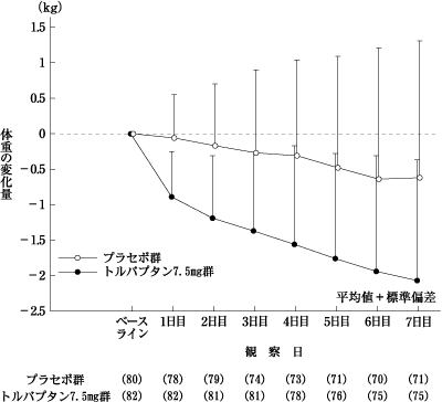 他の利尿薬を投与しても体液貯留が認められる肝硬変患者を対象とした二重盲検比較試験において、トルバプタン7.5mg又はプラセボを1日1回7日間経口投与した。主要評価項目である最終投与時の体重変化量は、トルバプタン7.5mg群-1.95±1.77kg(ベースライン:59.35±12.69kg、82例)(平均値±標準偏差、以下同様)、プラセボ群-0.44±1.93kg(ベースライン:59.15±13.15kg、80例)であり、トルバプタン群では、プラセボ群に比較して有意な体重減少が認められた(p<0.0001、t検定)。体重減少は投与翌日よりみられ投与期間を通じて継続した(図17-2)。最終投与時における肝性浮腫に伴う所見(腹水量、腹囲、下肢浮腫)が改善した(表17-2)。また、臨床症状(腹部膨満感、倦怠感、臥位での圧迫感、呼吸困難感、全身状態)も改善した。27)