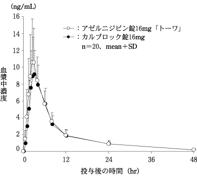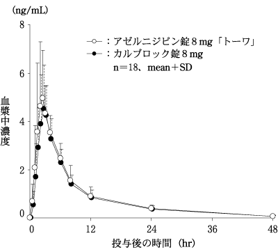 健康な成人男性6例にアゼルニジピン錠8mgを1日1回7日間連続経口投与したところ、最高血漿中濃度に到達する時間は2~3時間であり、半減期は19~23時間であった。投与後24時間の血漿中濃度は、投与2日目からほぼ一定の値を示し、速やかに定常状態に達した。1)