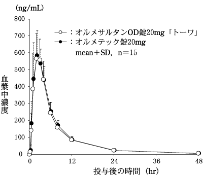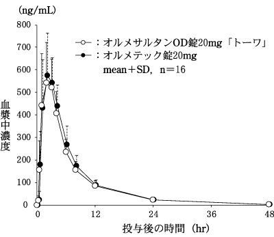 オルメサルタンOD錠40mg「トーワ」とオルメテック錠40mgを、クロスオーバー法によりそれぞれ1錠(オルメサルタン メドキソミルとして40mg)健康成人男子に絶食単回経口投与(水なしで服用及び水で服用)して血漿中オルメサルタン濃度を測定し、得られた薬物動態パラメータ(AUC、Cmax)について90%信頼区間法にて統計解析を行った結果、log(0.80)~log(1.25)の範囲内であり、両剤の生物学的同等性が確認された。8)