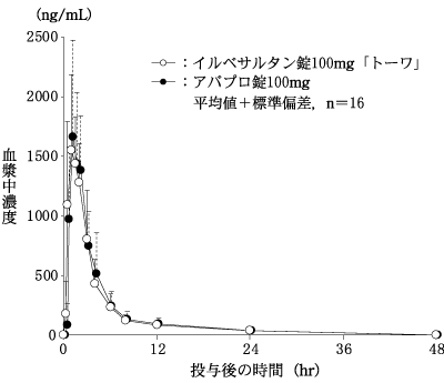 イルベサルタン錠100mg「トーワ」とアバプロ錠100mgを、クロスオーバー法によりそれぞれ1錠(イルべサルタンとして100mg)健康成人男子に絶食単回経口投与して血漿中未変化体濃度を測定し、得られた薬物動態パラメータ(AUC、Cmax)について90%信頼区間法にて統計解析を行った結果、log(0.80)~log(1.25)の範囲内であり、両剤の生物学的同等性が確認された。7)