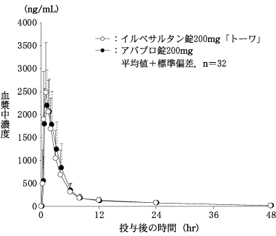 イルベサルタン錠200mg「トーワ」とアバプロ錠200mgを、クロスオーバー法によりそれぞれ1錠(イルべサルタンとして200mg)健康成人男子に絶食単回経口投与して血漿中未変化体濃度を測定し、得られた薬物動態パラメータ(AUC、Cmax)について90%信頼区間法にて統計解析を行った結果、log(0.80)~log(1.25)の範囲内であり、両剤の生物学的同等性が確認された。8)