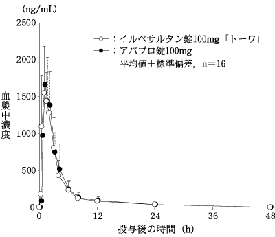 イルベサルタン錠100mg「トーワ」とアバプロ錠100mgを、クロスオーバー法によりそれぞれ1錠(イルべサルタンとして100mg)健康成人男子に絶食単回経口投与して血漿中未変化体濃度を測定し、得られた薬物動態パラメータ(AUC、Cmax)について90%信頼区間法にて統計解析を行った結果、log(0.80)~log(1.25)の範囲内であり、両剤の生物学的同等性が確認された7)。