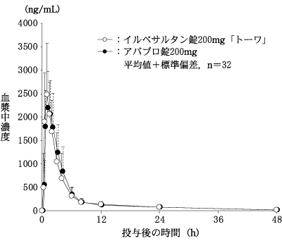 イルベサルタン錠200mg「トーワ」とアバプロ錠200mgを、クロスオーバー法によりそれぞれ1錠(イルべサルタンとして200mg)健康成人男子に絶食単回経口投与して血漿中未変化体濃度を測定し、得られた薬物動態パラメータ(AUC、Cmax)について90%信頼区間法にて統計解析を行った結果、log(0.80)~log(1.25)の範囲内であり、両剤の生物学的同等性が確認された8)。
