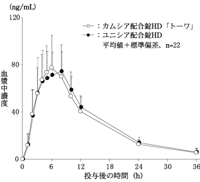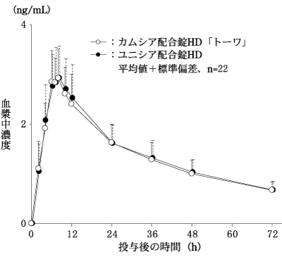 カムシア配合錠HD「トーワ」とユニシア配合錠HDを、クロスオーバー法によりそれぞれ1錠(カンデサルタン シレキセチルとして8mg及びアムロジピンとして5mg)健康成人男子に絶食単回経口投与してカンデサルタン及びアムロジピンの血漿中濃度を測定し、得られた薬物動態パラメータ(AUC、Cmax)について90%信頼区間法にて統計解析を行った。その結果、いずれもlog(0.80)~log(1.25)の範囲内であり、両剤の生物学的同等性が確認された。9)
