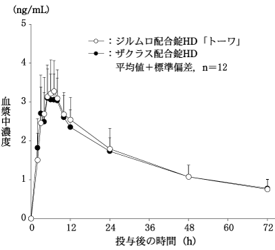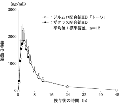 ジルムロ配合錠LD「トーワ」は、ジルムロ配合錠HD「トーワ」を標準製剤としたとき、溶出挙動が同等と判断され、生物学的に同等とみなされた20)。