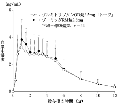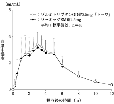 *ゾルミトリプタンOD錠2.5mg「トーワ」とゾーミッグRM錠2.5mgを、クロスオーバー法によりそれぞれ1錠(ゾルミトリプタンとして2.5mg)健康成人男子に絶食単回経口投与(水なしで服用及び水で服用)して血漿中未変化体濃度を測定し、得られた薬物動態パラメータ(AUC、Cmax)について90%信頼区間法にて統計解析を行った結果、log(0.80)~log(1.25)の範囲内であり、両剤の生物学的同等性が確認された。9)