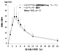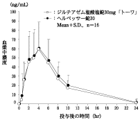 ジルチアゼム塩酸塩錠30mg「トーワ」とヘルベッサー錠30を、クロスオーバー法によりそれぞれ2錠(ジルチアゼム塩酸塩として60mg)健康成人男子に絶食単回経口投与して血漿中未変化体濃度を測定し、得られた薬物動態パラメータ(AUC、Cmax)について統計解析を行った結果、両剤の生物学的同等性が確認された。1)