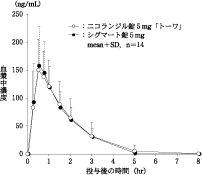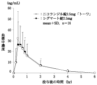 ニコランジル錠5mg「トーワ」とシグマート錠5mgを、クロスオーバー法によりそれぞれ2錠(ニコランジルとして10mg)健康成人男子に絶食単回経口投与して血漿中未変化体濃度を測定し、得られた薬物動態パラメータ(AUC、Cmax)について統計解析を行った結果、両剤の生物学的同等性が確認された。2)