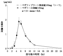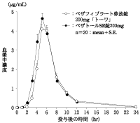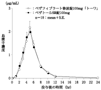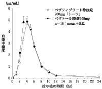 健康成人にベザフィブラート徐放錠200mgを単回経口投与した結果、最高血中濃度到達時間は4.5時間、最高血中濃度は3.5μg/mL、血中からの消失半減期は3時間、AUCは18μg・hr/mLであった。1)