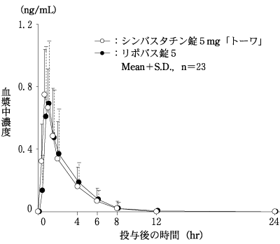 *シンバスタチン錠5mg「トーワ」とリポバス錠5を、クロスオーバー法によりそれぞれ1錠(シンバスタチンとして5mg)健康成人男子に絶食単回経口投与して血漿中未変化体濃度を測定し、得られた薬物動態パラメータ(AUC、Cmax)について90%信頼区間法にて統計解析を行った結果、log(0.80)~log(1.25)の範囲内であり、両剤の生物学的同等性が確認された。4)