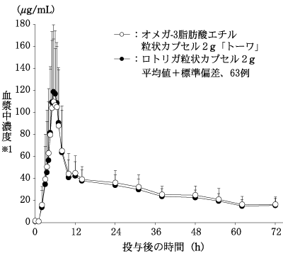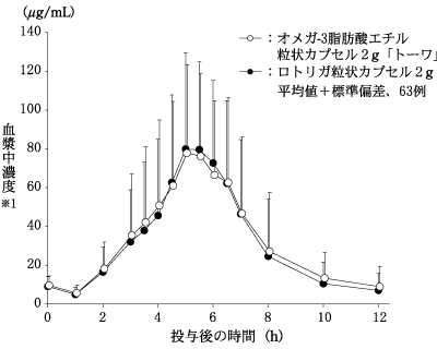 オメガ-3脂肪酸エチル粒状カプセル2g「トーワ」とロトリガ粒状カプセル2gを、クロスオーバー法によりそれぞれ2包(オメガ-3脂肪酸エチルとして4g)健康成人男子に食後単回経口投与して血漿中総イコサペント酸及び総ドコサヘキサエン酸濃度を測定し、得られた薬物動態パラメータ(AUC、Cmax)について90%信頼区間法にて統計解析を行った結果、いずれもlog(0.80)~log(1.25)の範囲内であり、両剤の生物学的同等性が確認された。6)