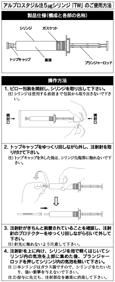 輸液に混和し、開始時アルプロスタジル5ng/kg/minとして持続静注し、その後は症状に応じて適宜増減して有効最小量とする。