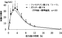 ファモチジン散2%「トーワ」とガスター散2%を、クロスオーバー法によりそれぞれ1包(ファモチジンとして10mg)健康成人男子に絶食単回経口投与して血漿中未変化体濃度を測定し、得られた薬物動態パラメータ(AUC、Cmax)について90%信頼区間法にて統計解析を行った結果、log(0.80)~log(1.25)の範囲内であり、両剤の生物学的同等性が確認された。4)