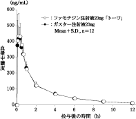 ファモチジン注射液20mg「トーワ」とガスター注射液20mgを、クロスオーバー法によりそれぞれ1管(ファモチジンとして20mg)健康成人男子(n=12)に絶食単回筋肉内投与して血漿中未変化体濃度を測定し、得られた薬物動態パラメータ(AUC、Cmax)について90%信頼区間法にて統計解析を行った結果、いずれもlog(0.80)~log(1.25)の範囲内であり、両剤の生物学的同等性が確認された。4)