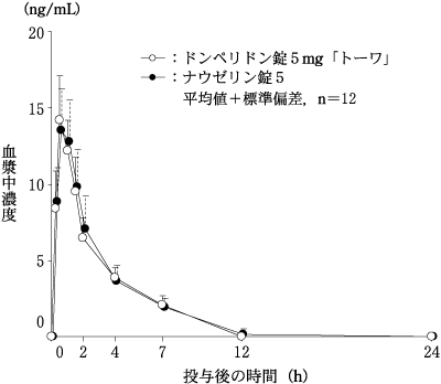 *ドンペリドン錠5mg「トーワ」とナウゼリン錠5を、クロスオーバー法によりそれぞれ2錠(ドンペリドンとして10mg)健康成人男子に絶食単回経口投与して血漿中未変化体濃度を測定し、得られた薬物動態パラメータ(AUC、Cmax)について統計解析を行った結果、両剤の生物学的同等性が確認された。1)