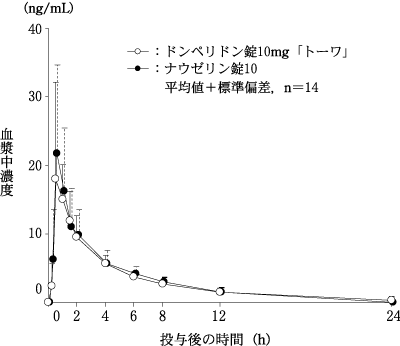 *ドンペリドン錠10mg「トーワ」とナウゼリン錠10を、クロスオーバー法によりそれぞれ2錠(ドンペリドンとして20mg)健康成人男子に絶食単回経口投与して血漿中未変化体濃度を測定し、得られた薬物動態パラメータ(AUC、Cmax)について統計解析を行った結果、両剤の生物学的同等性が確認された。2)