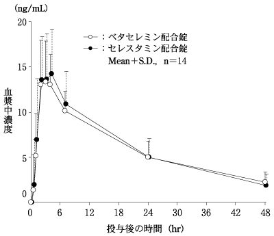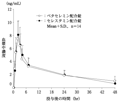 ベタセレミン配合錠とセレスタミン配合錠を、クロスオーバー法によりそれぞれ2錠(ベタメタゾンとして0.5mg及びd-クロルフェニラミンマレイン酸塩として4mg)健康成人男子に絶食単回経口投与して血漿中ベタメタゾン濃度及び血漿中d-クロルフェニラミンマレイン酸塩濃度を測定し、得られた薬物動態パラメータ(AUC、Cmax)について統計解析を行った結果、両剤の生物学的同等性が確認された。3)
