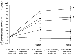 男性の男性型脱毛症患者にデュタステリド0.1及び0.5mgを1日1回24週間反復経口投与した時の結果を下表に示す。27)