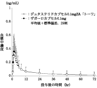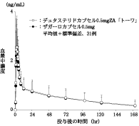 男性の男性型脱毛症患者にデュタステリド0.05~2.5mg注1)を1日1回24週間反復経口投与した時、投与後24週の平均血清中薬物濃度は0.1及び0.5mg投与群でそれぞれ1.51±0.96及び30.69±13.90ng/mLであった。消失は非線形であり、血清中デュタステリド濃度が低い場合、高濃度域と比べて速やかに消失した。デュタステリド0.1及び0.5mgを24週間反復投与した時、血清中薬物濃度はそれぞれ最終投与後12及び20週時で定量下限(0.1ng/mL)未満であった(外国人データ)。5)前立腺肥大症患者にデュタステリド0.5mgを1日1回6ヵ月間反復経口投与した時、投与後6ヵ月の血清中薬物濃度は44.82±17.91ng/mLであった。また、定常状態におけるt1/2は3.4±1.2週間であった。6)