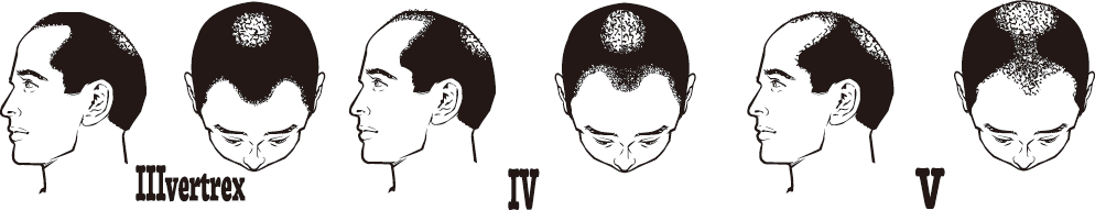 20歳から50歳の男性の男性型脱毛症患者(Norwood-Hamilton分類22)のⅢv、Ⅳ又はⅤ:図1)120例を対象とし、デュタステリド0.5mgを52週間投与した際の安全性及び有効性を検討した。その結果、52週時の頭頂部円内(直径2.54cm円中)の毛髪数のベースラインからの変化量は、68.1本であり改善が示された。副作用発現頻度は、16.7%(20/120例)であった。主な副作用は、勃起不全10.8%(13/120例)、リビドー減退8.3%(10/120例)、射精障害4.2%(5/120例)であった。25)