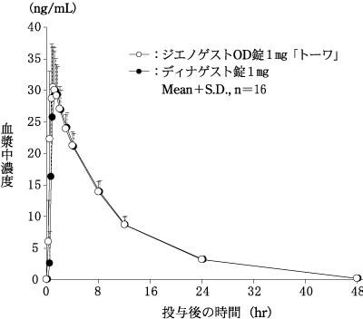 健康成人男性20例にジエノゲスト2mgを絶食単回経口投与(錠剤)及び静脈内投与注2)したとき、生物学的利用率は90.55%であった(外国人データ)。7)