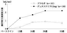前立腺体積30mL以上の前立腺肥大症患者を対象とした二重盲検比較試験(1日1回52週間経口投与)において、デュタステリド0.5mgはプラセボに比し、I-PSS及び最大尿流率を有意に改善し、前立腺体積を有意に減少させた。