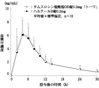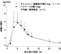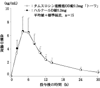 健康成人29名にハルナールD錠0.2mgあるいはハルナール0.2mgカプセルをそれぞれクロスオーバー法で単回経口投与した場合、タムスロシン塩酸塩の血漿中未変化体の薬物動態パラメータは以下のとおりである。ハルナールD錠とハルナールカプセルは生物学的に同等であった。3),4),5)