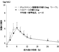 タムスロシン塩酸塩OD錠0.2mg「トーワ」とハルナールD錠0.2mgを、クロスオーバー法によりそれぞれ1錠(タムスロシン塩酸塩として0.2mg)健康成人男子に絶食単回経口投与(水なしで服用及び水で服用)及び食後単回経口投与(水なしで服用及び水で服用)して血漿中未変化体濃度を測定し、得られた薬物動態パラメータ(AUC、Cmax)について90%信頼区間法にて統計解析を行った結果、log(0.80)~log(1.25)の範囲内であり、両剤の生物学的同等性が確認された。6)