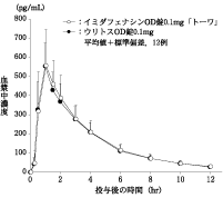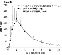 イミダフェナシンOD錠0.1mg「トーワ」とウリトスOD錠0.1mgを、クロスオーバー法によりそれぞれ1錠(イミダフェナシンとして0.1mg)健康成人男子に絶食単回経口投与(水なしで服用及び水で服用)して血漿中未変化体濃度を測定し、得られた薬物動態パラメータ(AUC、Cmax)について90%信頼区間法にて統計解析を行った結果、いずれもlog(0.80)~log(1.25)の範囲内であり、両剤の生物学的同等性が確認された。3)
