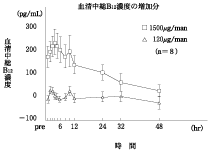 健康成人男子に1,500μgを12週間反復経口投与し、投与中止後4週間の血清中総B12量の変動率を検討した。投与4週間で投与前値の約2倍に達し、以後も漸増し、12週後には約2.8倍を示した。投与中止4週後でも投与前値の約1.8倍を示した。2),3)