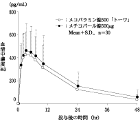 メコバラミン錠500「トーワ」とメチコバール錠500μgを、クロスオーバー法によりそれぞれ6錠(メコバラミンとして3,000μg)健康成人男子に絶食単回経口投与して血清中ビタミンB12濃度を測定し、得られた薬物動態パラメータ(AUC、Cmax)について統計解析を行った結果、両剤の生物学的同等性が確認された。4)