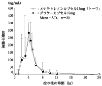 メナテトレノンカプセル15mg「トーワ」とグラケーカプセル15mgを、クロスオーバー法によりそれぞれ1カプセル(メナテトレノンとして15mg)健康成人男子に食後単回経口投与して血漿中未変化体濃度を測定し、得られた薬物動態パラメータ(AUC、Cmax)について90%信頼区間法にて統計解析を行った結果、log(0.80)~log(1.25)の範囲内であり、両剤の生物学的同等性が確認された。3)