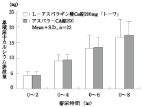 L-アスパラギン酸Ca錠200mg「トーワ」とアスパラ-CA錠200を、クロスオーバー法によりそれぞれ6錠(L-アスパラギン酸カルシウム(無水物)として1200mg)健康成人男子に絶食単回経口投与して投与8時間後まで尿中カルシウム排泄量を測定し、得られた薬物動態パラメータ(累積尿中カルシウム排泄量、最大尿中カルシウム排泄速度)について90%信頼区間法にて統計解析を行った結果、log(0.80)~log(1.25)の範囲内であり、両剤の生物学的同等性が確認された。1)