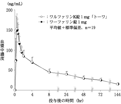 ワルファリンK錠1mg「トーワ」とワーファリン錠1mgを、クロスオーバー法によりそれぞれ1錠(ワルファリンカリウムとして1mg)健康成人男子に絶食単回経口投与して血漿中未変化体濃度を測定し、得られた薬物動態パラメータ(AUC、Cmax)について90%信頼区間法にて統計解析を行った結果、log(0.80)~log(1.25)の範囲内であり、両剤の生物学的同等性が確認された。8)