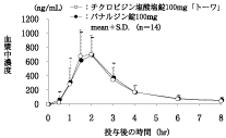 チクロピジン塩酸塩錠100mg「トーワ」とパナルジン錠100mgを、クロスオーバー法によりそれぞれ3錠(チクロピジン塩酸塩として300mg)健康成人男子に絶食単回経口投与して血漿中未変化体濃度を測定し、得られた薬物動態パラメータ(AUC、Cmax)について統計解析を行った結果、両剤の生物学的同等性が確認された。1)