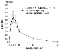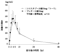 シロスタゾール錠50mg「トーワ」とプレタール錠50mgを、クロスオーバー法によりそれぞれ1錠(シロスタゾールとして50mg)健康成人男子に絶食単回経口投与して血漿中未変化体濃度を測定し、得られた薬物動態パラメータ(AUC、Cmax)について90%信頼区間法にて統計解析を行った結果、log(0.80)~log(1.25)の範囲内であり、両剤の生物学的同等性が確認された。10)