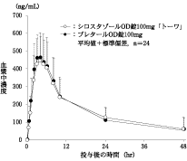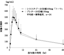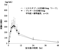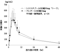 シロスタゾールOD錠50mg「トーワ」とプレタールOD錠50mgを、クロスオーバー法によりそれぞれ1錠(シロスタゾールとして50mg)健康成人男子に絶食単回経口投与(水なしで服用及び水で服用)して血漿中未変化体濃度を測定し、得られた薬物動態パラメータ(AUC、Cmax)について90%信頼区間法にて統計解析を行った結果、log(0.80)~log(1.25)の範囲内であり、両剤の生物学的同等性が確認された。10)