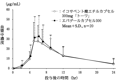 *イコサペント酸エチルカプセル300mg「トーワ」とエパデールカプセル300を、クロスオーバー法によりそれぞれ6カプセル(イコサペント酸エチルとして1,800mg注3))健康成人男子に食後単回経口投与して血漿中総イコサペント酸濃度を測定し、得られた薬物動態パラメータ(AUC、Cmax)について統計解析を行った結果、両剤の生物学的同等性が確認された。5)
