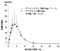 グリベンクラミド錠2.5mg「トーワ」とオイグルコン錠2.5mgを、クロスオーバー法によりそれぞれ1錠(グリベンクラミドとして2.5mg)健康成人男子に絶食単回経口投与して血漿中未変化体濃度を測定し、得られた薬物動態パラメータ(AUC、Cmax)について統計解析を行った結果、両剤の生物学的同等性が確認された。1)