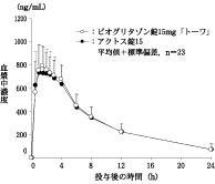 メトホルミン反復投与中の健康成人男子(14例)に対して、1日1回ピオグリタゾンとして30mgを経口投与した時、ピオグリタゾンの活性化合物合計(未変化体+M-Ⅱ~Ⅳ)の血中濃度はピオグリタゾン単独投与時の健康成人男子での結果と近似している。16)