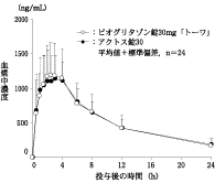 ボグリボース使用中の2型糖尿病患者(42例)に対して、1日1回ピオグリタゾンとして30mgを経口投与した時、ピオグリタゾンの活性化合物合計(未変化体+M-Ⅱ~Ⅳ)の血中濃度は食事療法のみ又はスルホニルウレア剤使用中の2型糖尿病患者での結果と近似している。14),15)
