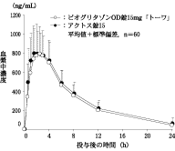 ピオグリタゾンOD錠15mg「トーワ」とアクトス錠15を、クロスオーバー法によりそれぞれ1錠(ピオグリタゾンとして15mg)健康成人男子に絶食単回経口投与(水なしで服用及び水で服用)して血漿中未変化体濃度を測定し、得られた薬物動態パラメータ(AUC、Cmax)について統計解析を行った結果、水なしで服用した場合は、判定パラメータの対数値の平均値の差の90%信頼区間がlog(0.80)~log(1.25)の範囲内であったこと、水で服用した場合は、判定パラメータの対数値の平均値の差がlog(0.90)~log(1.11)で、かつ、溶出試験で規定するすべての条件で溶出挙動が類似していたことから、両剤の生物学的同等性が確認された。9)