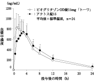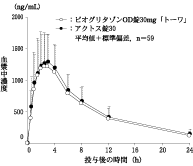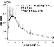メトホルミン反復投与中の健康成人男子(14例)に対して、1日1回ピオグリタゾンとして30mgを経口投与した時、ピオグリタゾンの活性化合物合計(未変化体+M-Ⅱ~Ⅳ)の血中濃度はピオグリタゾン単独投与時の健康成人男子での結果と近似している。16)