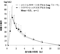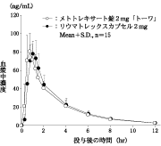 メトトレキサート錠2mg「トーワ」1錠とリウマトレックスカプセル2mg1カプセル(メトトレキサートとして2mg)を、クロスオーバー法により健康成人男子に絶食単回経口投与して血漿中未変化体濃度を測定し、得られた薬物動態パラメータ(AUC、Cmax)について90%信頼区間法にて統計解析を行った結果、log(0.80)~log(1.25)の範囲内であり、両剤の生物学的同等性が確認された。5)